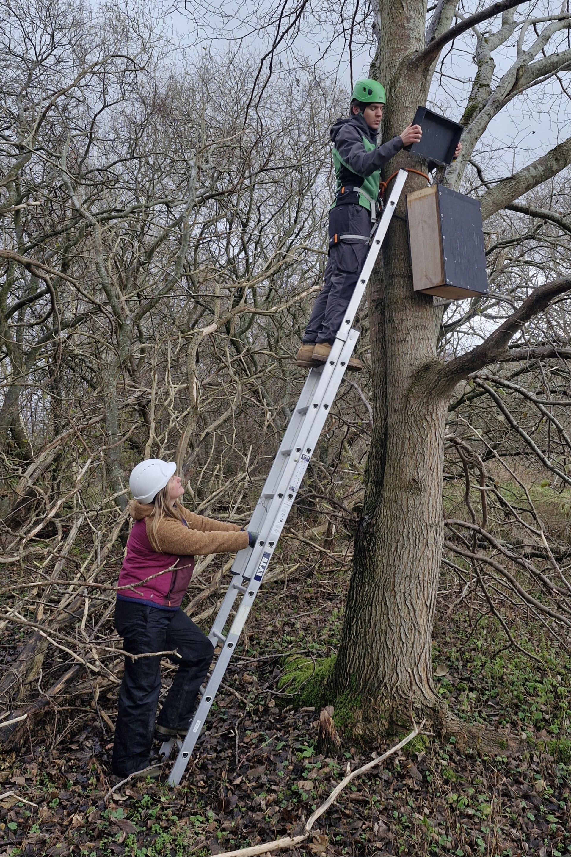 Many of our den boxes are secured to the tree with polypropylene rope. Over the years, trees grow, trunks expand and the rope will begin to cut into the trunk if not loosened off in time. It is not just a matter of simply loosening the knot, the den box needs to be secured on the pulley and rope system used for installation and slightly raised to take the weight of the box off the rope, making it loose enough to adjust — a tricky job with wet, algae-covered rope and cold fingers!