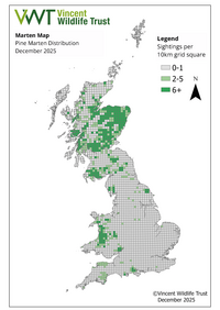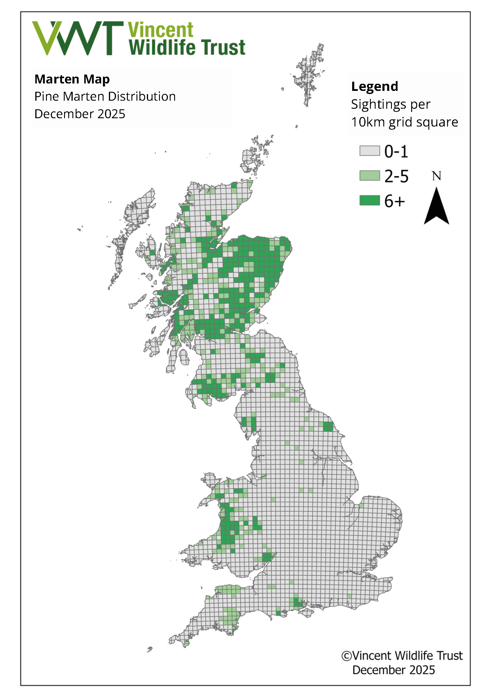 The latest map showing the distribution of pine martens across Britain up to the end of December 2025.